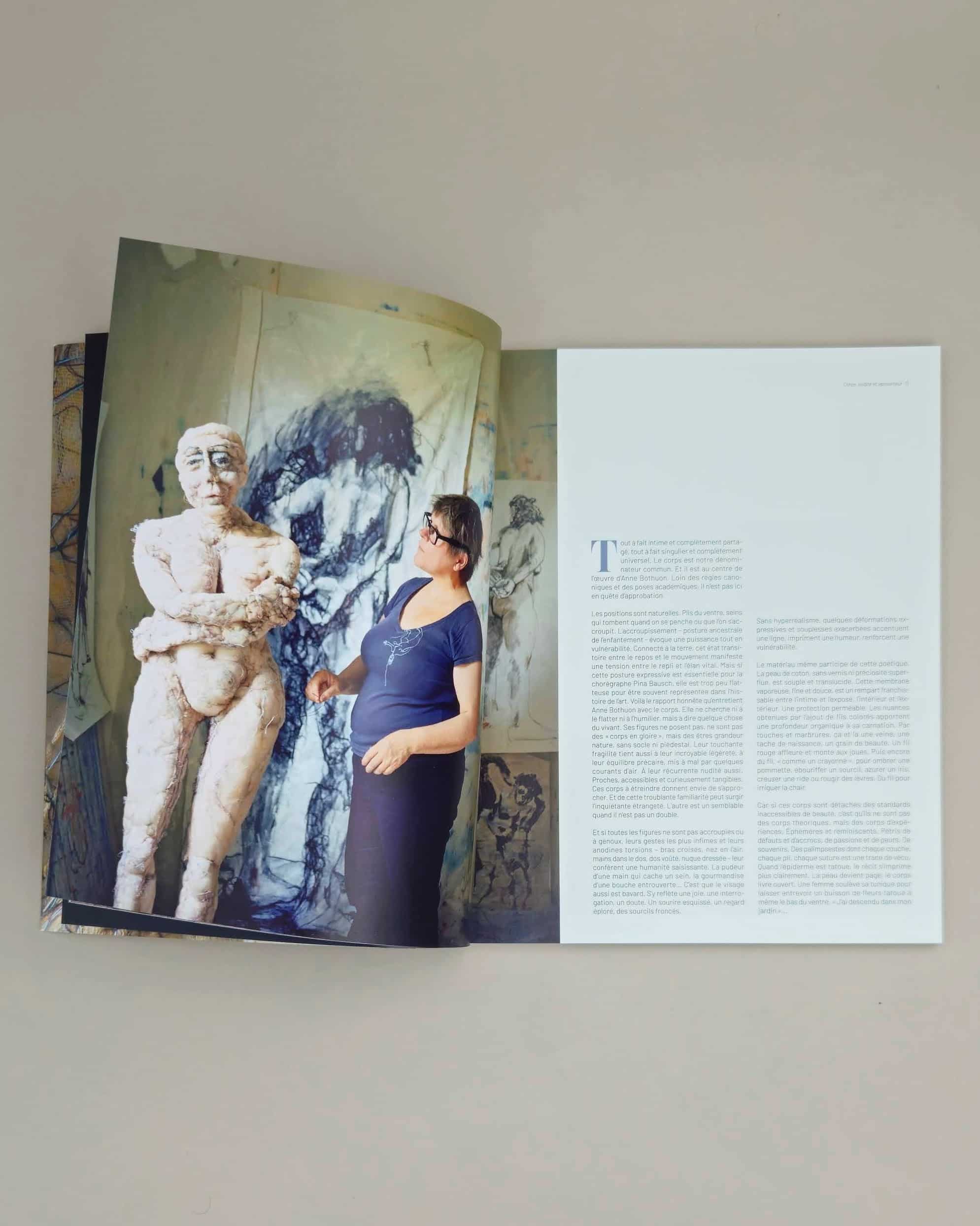Anne Bothuon repense la sculpture en modelant l’ouate, la tarlatane et le fil plutôt que la pierre ou le bronze. Sa « broderie sauvage » creuse et renfle ces matériaux humbles pour créer des corps grandeur nature. Sans socle ni piédestal, ces êtres de tissu occupent l’espace avec une présence troublante. « J’aime ce corps abîmé, normal », confie l’artiste qui refuse l’idéalisation. Elle préfère les ventres qui plient, les seins qui tombent, les rides qui racontent – le fond de teint et la chirurgie lui sont « insupportables ».