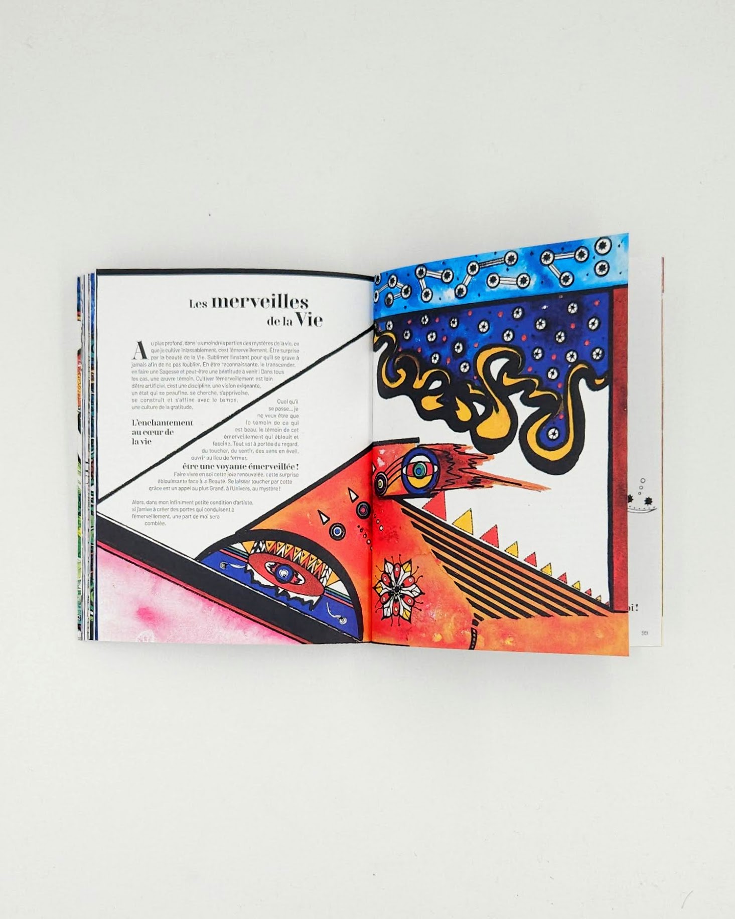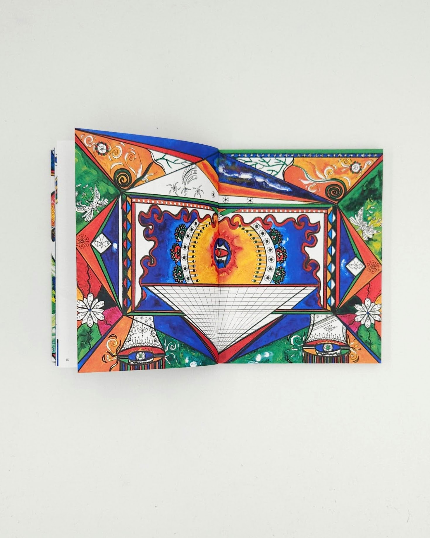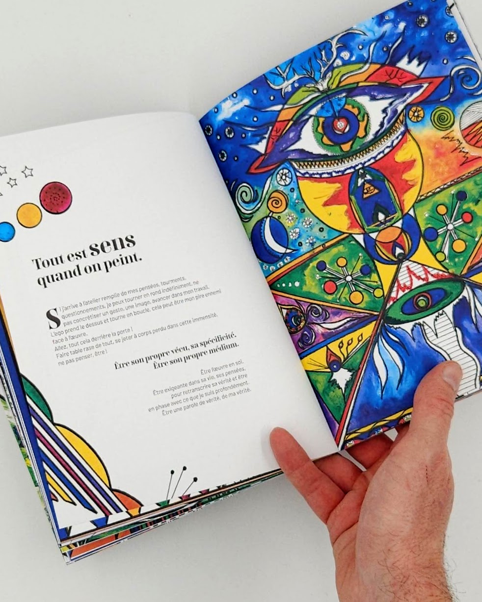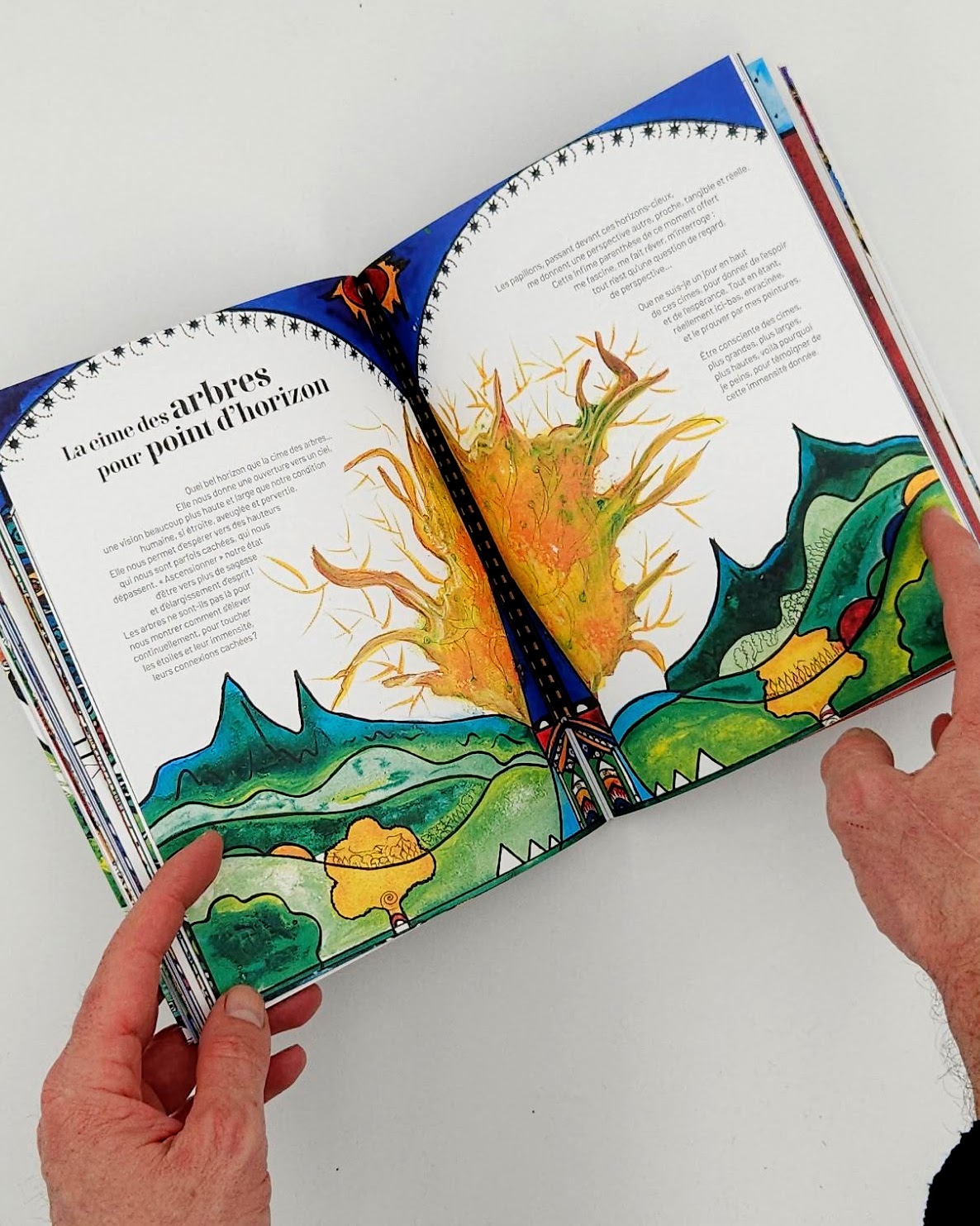Ce livre explore comment s’élabore une œuvre. Quelles en sont les racines intimes, les logiques internes ? Quelle part pour l’imaginaire, quelle part pour l’expérience ? Lâcher-prise ou construction raisonnée ? Vittoretti répond en mêlant textes introspectifs et dessins. Elle raconte l’atelier comme un champ de terre à cultiver, la discipline qu’exige sa quête de lumière, les moments de doute aussi. Le dessin qui ouvre le livre condense cette recherche : un arbre relie la terre au ciel étoilé, le soleil et la lune dialoguent, des motifs géométriques structurent le végétal. Damiers, triangles, étoiles : tout est architecture sous l’apparente profusion. Cet arbre devient axe cosmique, synthèse d’un message tourné vers la joie et l’énergie vitale.