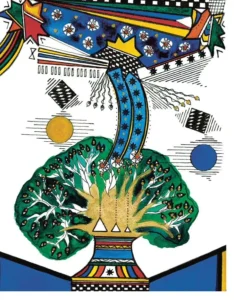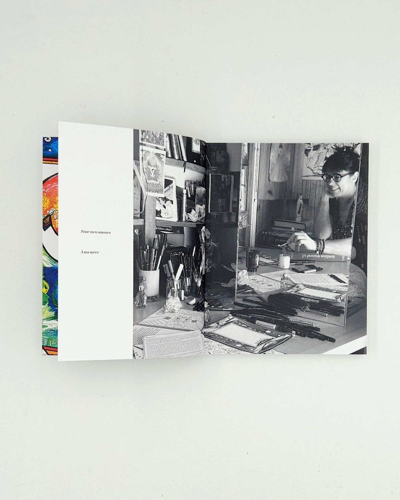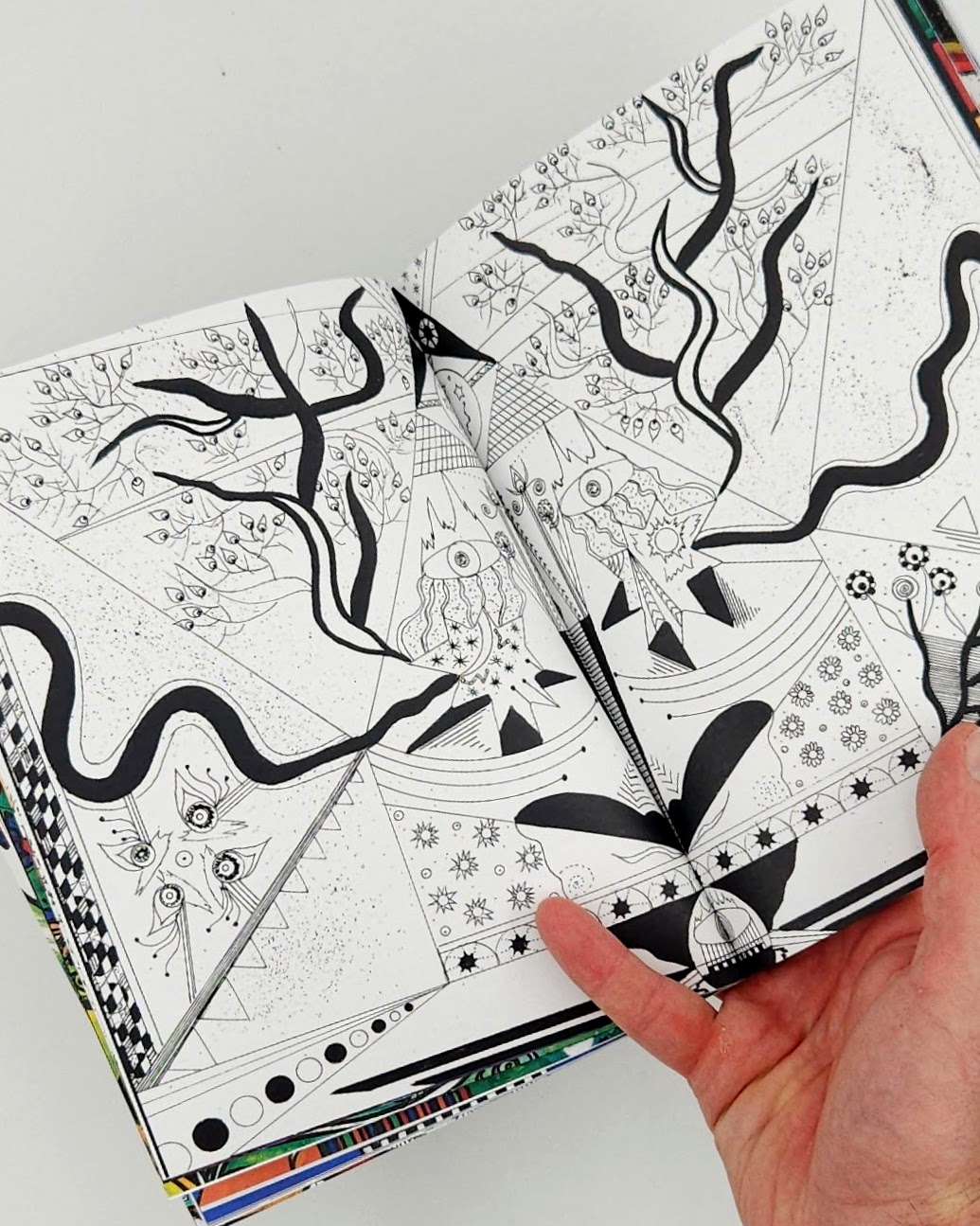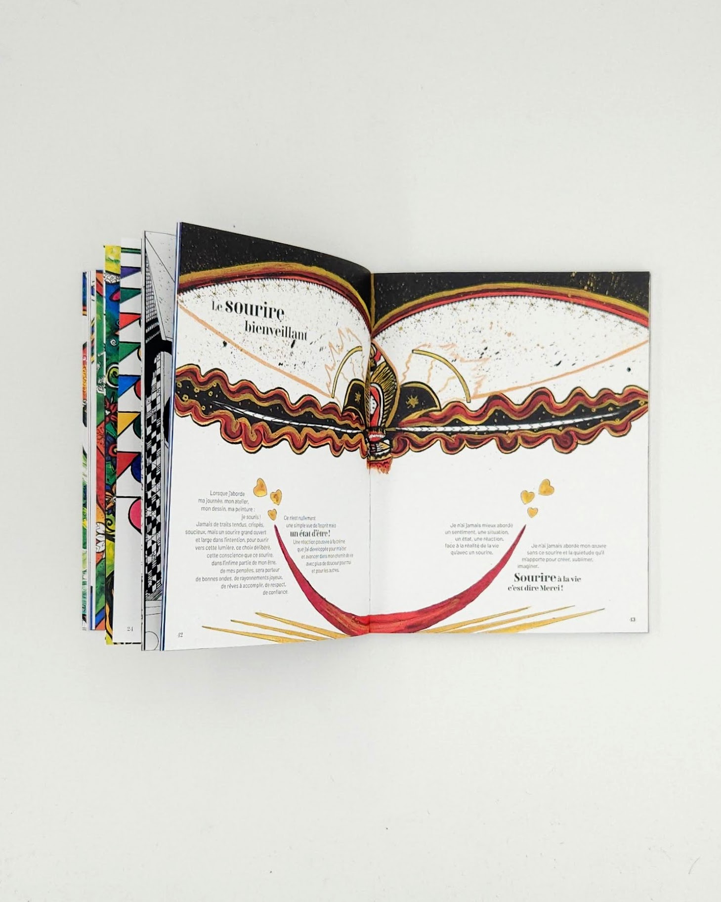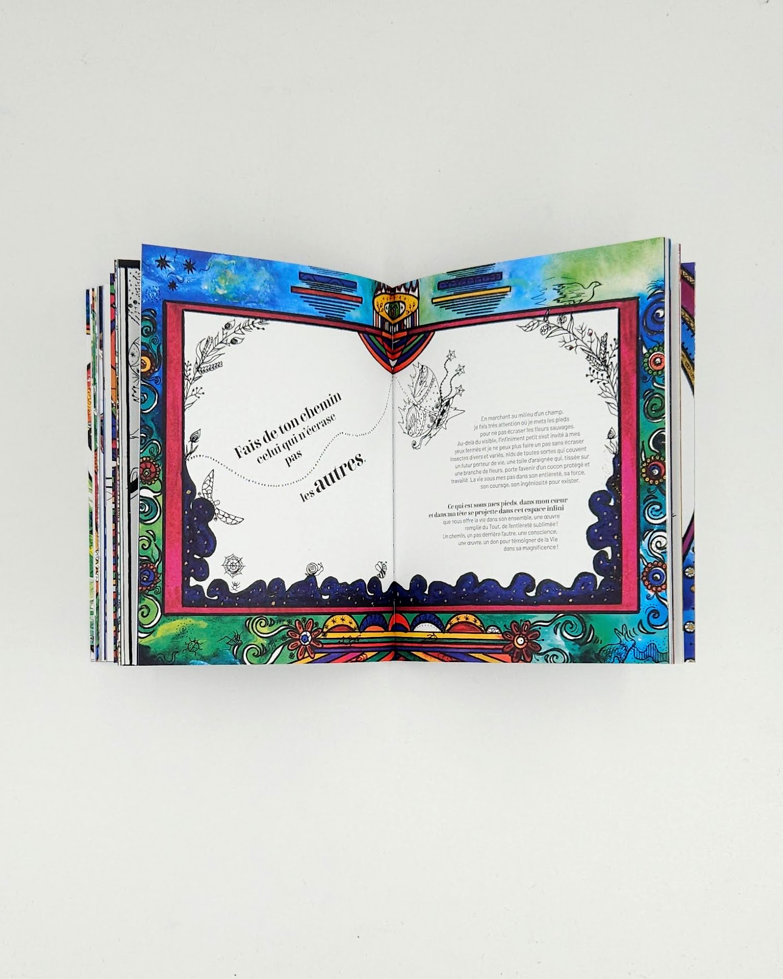 Ce livre explore comment s’élabore une œuvre. Quelles en sont les racines intimes, les logiques internes ? Quelle part pour l’imaginaire, quelle part pour l’expérience ? Lâcher-prise ou construction raisonnée ? Vittoretti répond en mêlant textes introspectifs et dessins. Elle raconte l’atelier comme un champ de terre à cultiver, la discipline qu’exige sa quête de lumière, les moments de doute aussi. Le dessin qui ouvre le livre condense cette recherche : un arbre relie la terre au ciel étoilé, le soleil et la lune dialoguent, des motifs géométriques structurent le végétal. Damiers, triangles, étoiles : tout est architecture sous l’apparente profusion. Cet arbre devient axe cosmique, synthèse d’un message tourné vers la joie et l’énergie vitale.